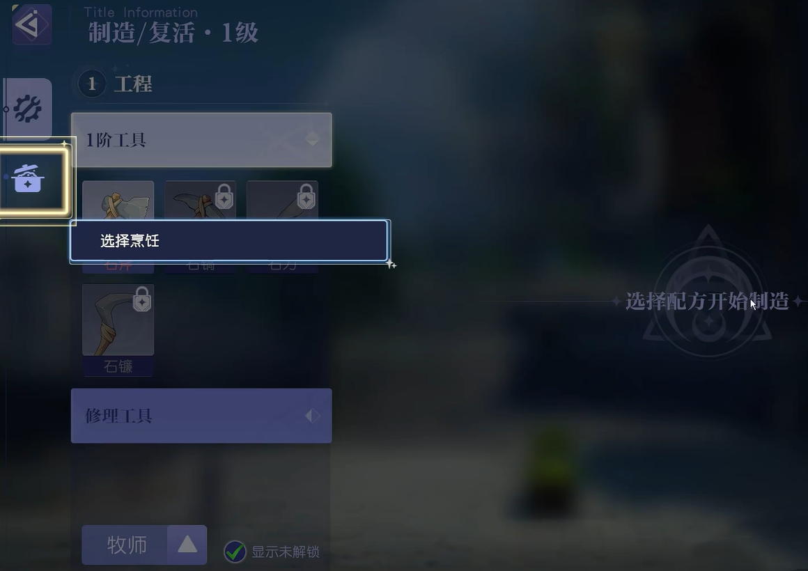之后我们再跟营地对话,点击第一个打造。就可以进去了,第二个东西就是烹饪。烹饪又分成两种东西,第一种的话就是我们常见的药剂。药剂算是烹调,一般都用来恢复血量。但是我们的目的是制造美食,所以建议点击下一个选项。