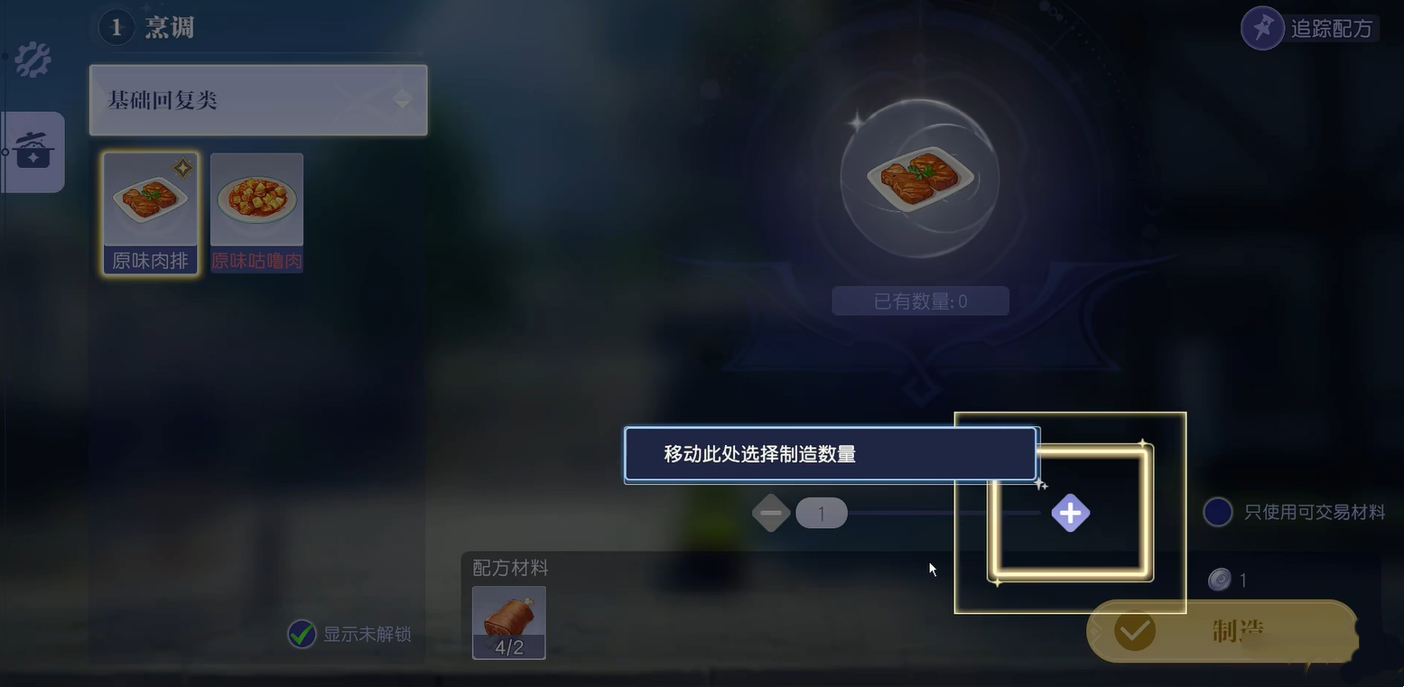 也就是所谓的基础回复类,映入眼帘的第一个便是原味肉排。点击之后就可以加入你当前所拥有的羊肉碎块,想要制造一个的话就需要花两个肉块才行。之后再选择你想要制作的数量,一般来说两个就可以了,一个可以要花费一枚银币,再点击右边的制造,静等一会儿就能开始烹饪了。