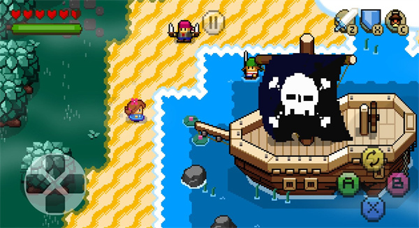 3、你可以通过大船前往其他的岛屿,左侧的按键可以控制角色的前进方向,右侧的按键可以跳跃、冲刺、攻击等。