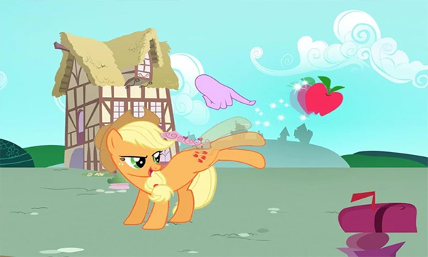 橙黄色身体,金色鬃毛,翡翠绿眼睛,头戴牛仔帽小马。可爱标志为三颗苹果,是小马驹系列第一代就有的元老小马。