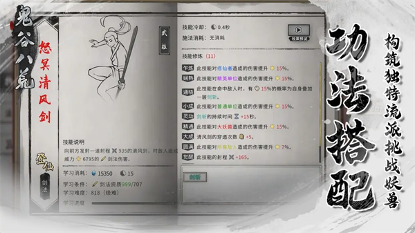 1、鬼谷八荒破解版里有非常多的武学技能,各种心法、武技、身法、绝招神勇。