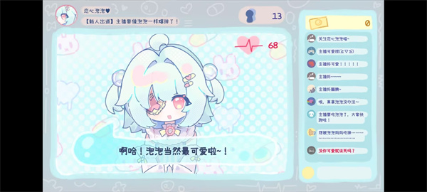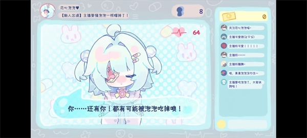 主播要像泡泡一样爆掉了手游是一款非常好玩的二次元可爱风格的水色系画风的Vtuber模拟游戏,是由B站UP“莲花池池”自制的休闲游戏,在游戏中玩家将作为一名刚出道的Vtuber,直播间中没有多少观众,需要留住这些观众进行对话选择,尽可能把直播间带火。