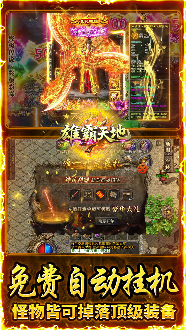 雄霸天地传奇手游是一款以1.76版本为基础开发的全新手打传奇版本,在这里任何地图都可爆出终极装备和特殊顶级装备,所有装备材料产出均只能通过怪物爆出获得,普通散人不需要氪金也可以获取海量奖励,更有超高爆率,全图切割等BUFF,让你轻松无限畅玩。