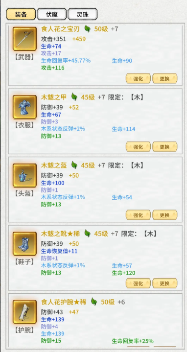 用生命回复率的木属性套装即可,推荐45级的【木魃套装】。