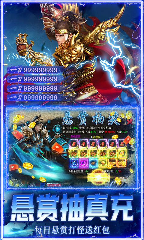 3、悬赏抽奖:每日打怪即可抽取代币、充值卡、红包,激活永久累充福利。