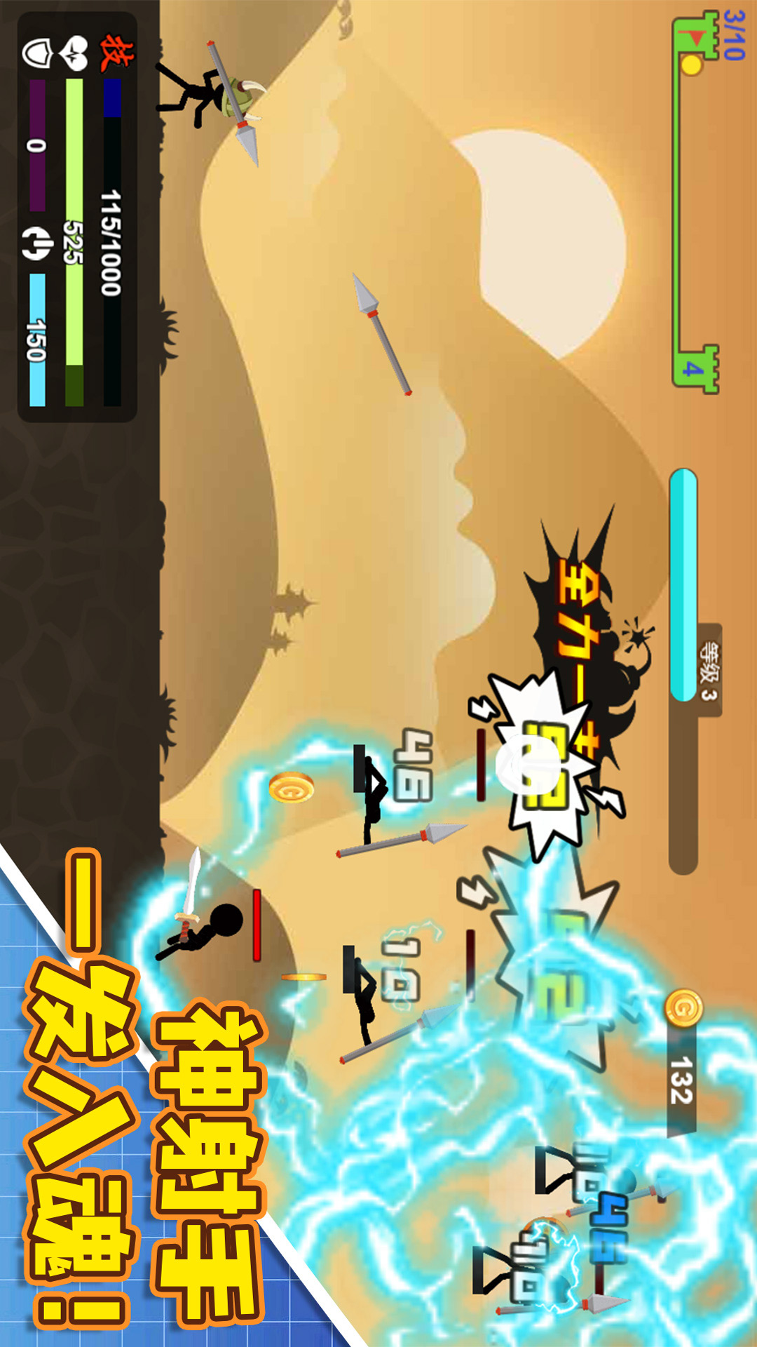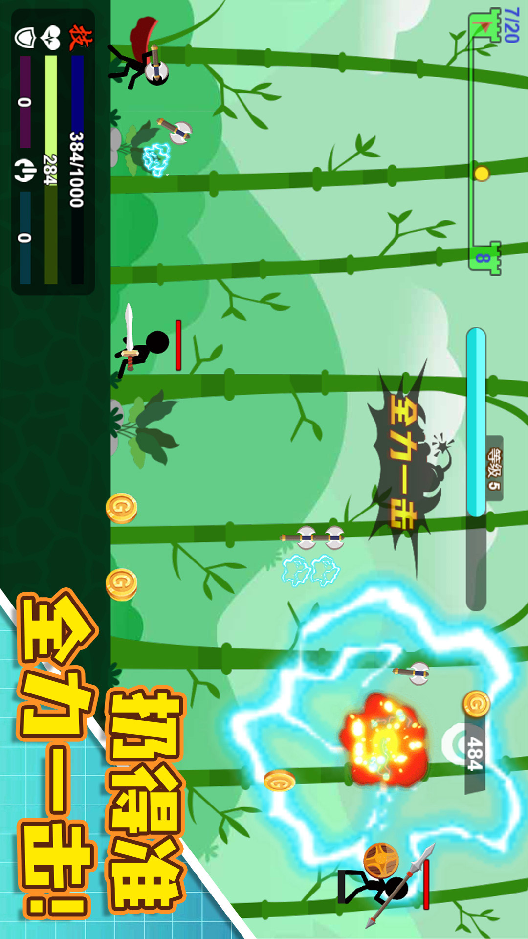 2、按住屏幕调整投掷角度,滑动控制力度,松手后火柴人将掷出利剑攻击目标。