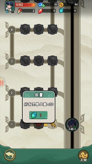 在天赋界面优先解锁 “血量” 天赋,可为所有灵兽增加 20 血量,提升队伍生存能力。