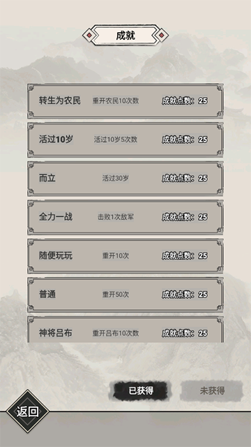 3、点击屏幕即可开始游戏,吕布会从出生开始成长,成长过程以“年”为单位推进,在这一阶段你需要做出多次选择,这些选择会直接影响左上角属性的增减。