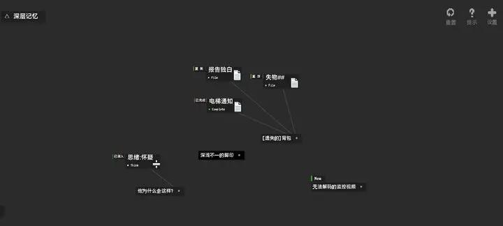1、浅层记忆下:单击线索“一封信件”+“电梯维修”进行调查,分别出现线索“[遗失的]背包”+“被困在电梯里的人”;