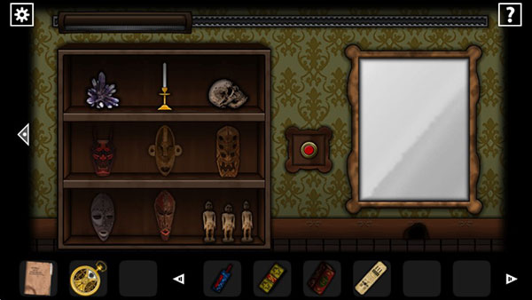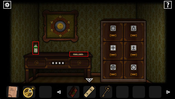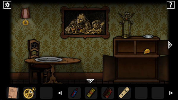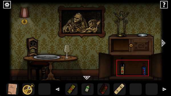 6、出来到右边的门(餐厅),拿走柜里的书,用钥匙打开下面的柜子拿走甜味剂和密封的酒,把酒放进柜顶的开瓶器,根据二图右边骷髅画上的眉毛位置以中中,上下,中上,下下,上上的顺序开瓶,摆好一次按一次红色按钮,拿走打开的酒,把安眠药水和酒倒进桌上的高脚杯里,获得一杯酒。