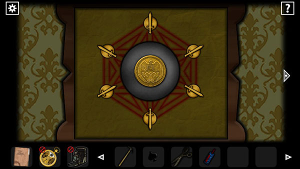 14、依旧是寝室,墙上有机关画,根据图书馆左边墙上的乌鸦可以知道要六把剑全部朝里,开始扭机关,左下角开始扭动剑,点击剑可以扭动剑头指向的方向那把剑,扭好后在机关中间获得硬币。