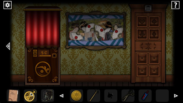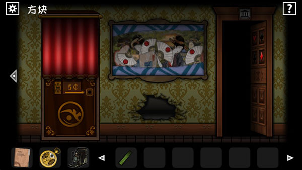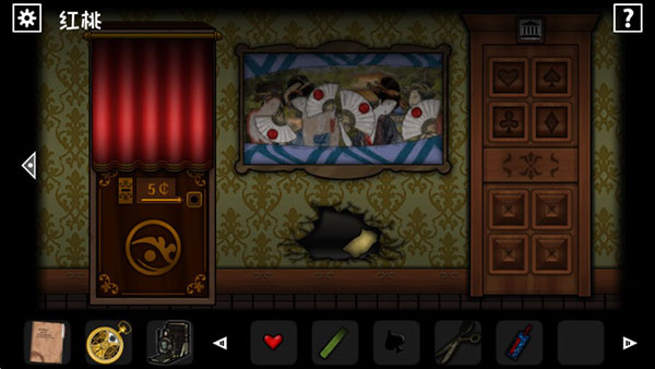 16、五图用相机观察,挂画下方有个红色的X,用锤子砸破后得到红桃和纸片。