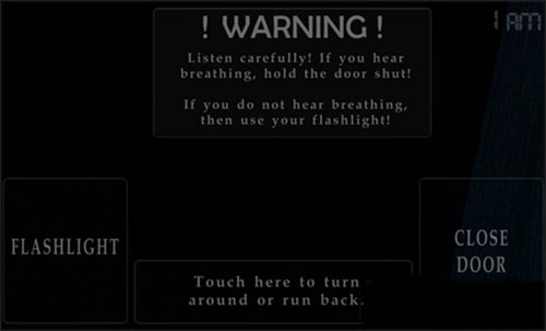 操作上本作也做了较大的改变,这一关玩家不再是通过监视器来确认玩具熊的动向,而是亲自到门口听声音确认玩具熊,因此本作小编认为是系列作品中最为恐怖的,胆小的自己走远些,另外由于是听声音辨认,所以游戏对于音效设备的要求还是蛮大