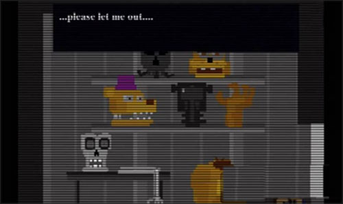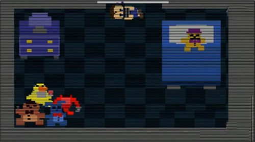 初始进入游戏后发现一个小男孩被人锁在屋内,屋内还有黄金泰迪熊和前几代的玩具熊:佛雷迪熊、奇卡鸡、邦尼兔、海盗狐狸,小男孩尝试出去但做不到。