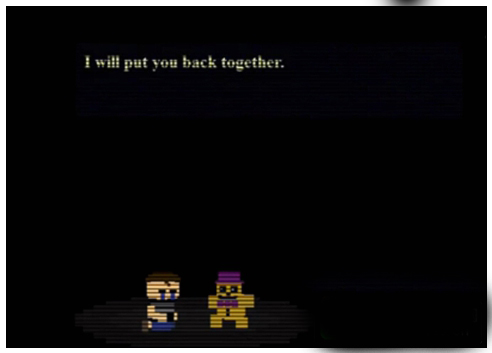 之后如果玩家通过第六夜的话,就会有好结局出现:黄金弗莱迪和他的玩具熊一起出现,为小男孩受伤的事向他道歉,并允若他们依旧是好朋友,之后玩具熊和小男孩就一一消失,就好像这个梦魇已经消失了。
