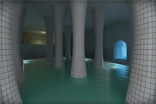在水深及脚踝的广阔区域中漫步,周围都是覆盖墙壁、地板和天花板的白色瓷砖。
