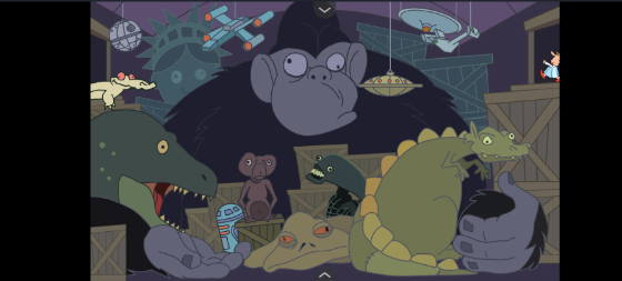 1、首先,场景中包括了一个奇特的组合:恐龙头、飞碟、左右两侧的动物头和恐龙尾,左边的大手以及左上角的地球仪,构成了一幅富有想象力的画面。