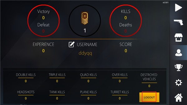 2、接下来玩家需要登录自己的账号才能进入战场,如果没有账号的话,点击头像图标,点击【logout】。