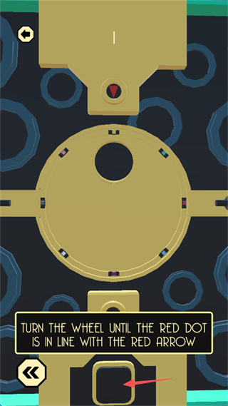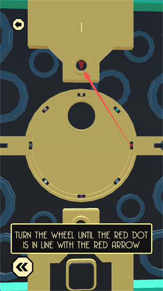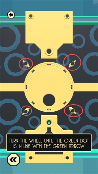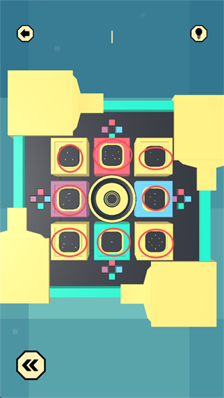 8、观察上下左右四个方向的“颜色对应方向”,并通过点击屏幕中间的“黄圆形标识”控制大型的四色方块,颜色方向对应“四周的小颜色方向”。