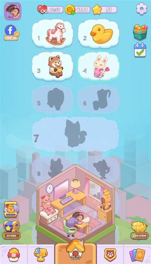 2、提供丰富的关卡供你挑战,能进行特色主题房间搭建。