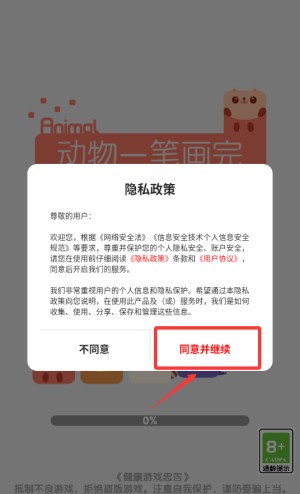 1、点击红框同意并继续按钮,确认隐私政策开始游戏。