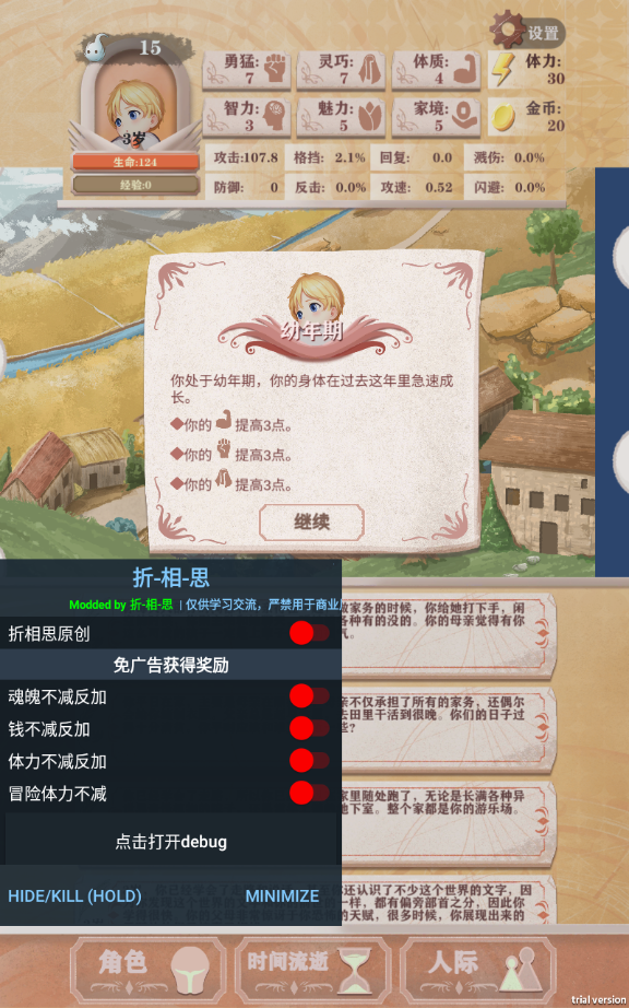 v3.22异世轮回录折相思内置修改器是一款放置类剧情手游,其中最突出的特色就是每一生的经历和故事情节,随机性非常高,非常考验玩家们的连贯思维能力!在游戏当中开启一次次的异世界人生,文字模拟类场景呈现,给玩家们带来了更多的想象空间!此版本为折相思内置修改器版本,可以给玩家们带来更加流畅的游戏体验。