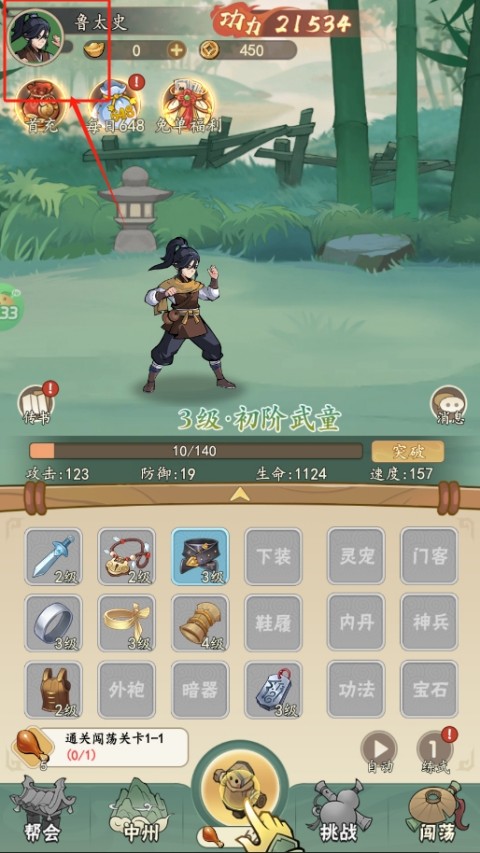 进入游戏后,玩家将开始自己的历练之旅,通过点击训练可以获得装备
