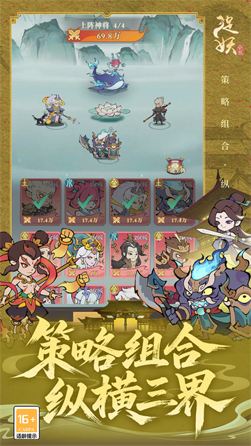 3、神将阵容国风元素的神将立绘,海量的神等方面人物,玩家可以自由编队,组建别样的降妖队伍。