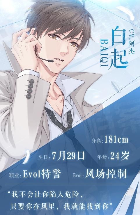 白起,手游《恋与制作人》中男主角之一。曾任职于恋语市公安总局,以公安特警的身份为自己的真实行动做掩护,在暗中保护你。真正身份为特遣署特别行动部的Evol特警,Evol为风场控制。现为特遣署总指挥官。