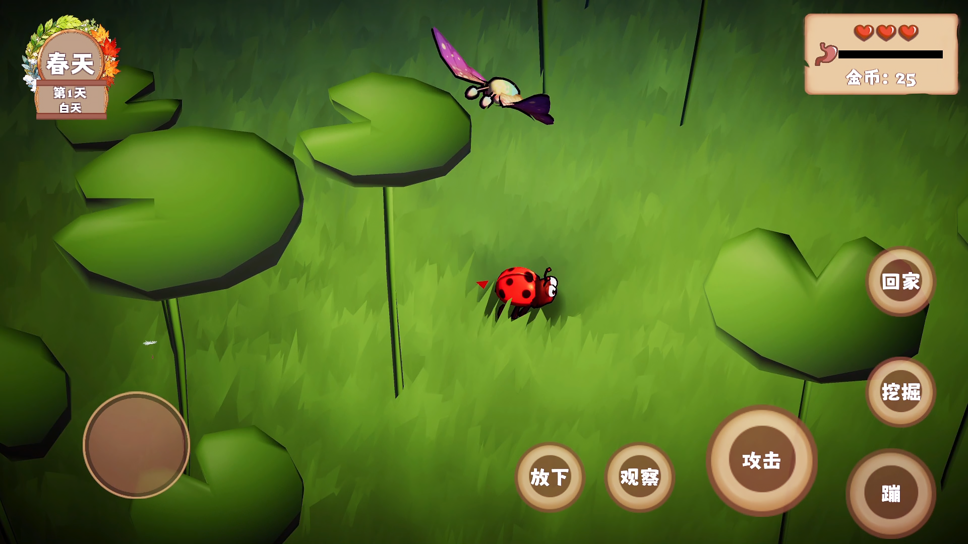 1、游戏以第一人称视角模拟昆虫生活,玩家将操控一只小型节肢动物在自然环境中完成生存挑战,整个周期设定为持续12个游戏日的主线任务。