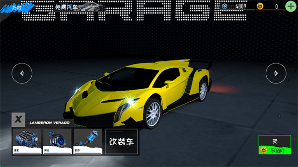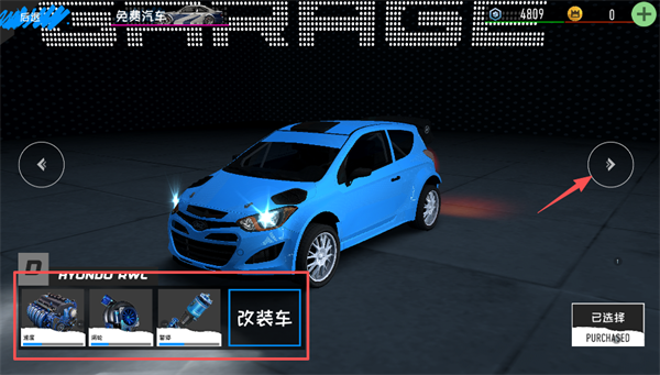 7、在屏幕左下方可以自由改装车辆的性能,或者自定义车辆的外观,还可以点击屏幕左右两侧的“箭头”更换车辆。