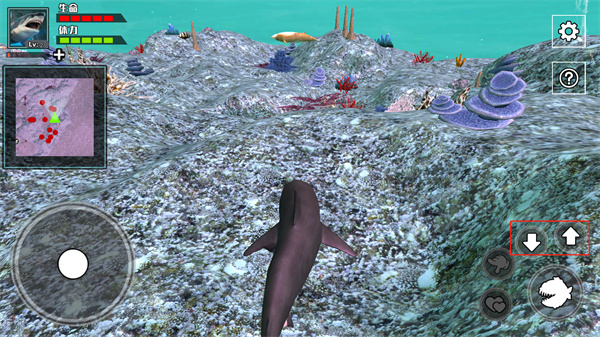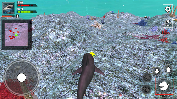 7、每捕食一条鱼都会获得经验,等鲨鱼到10级后,玩家还可以通过两个爱心按钮进行生育;