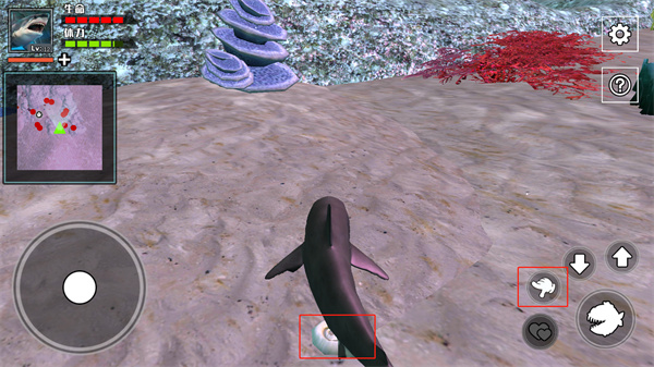 4、当遇到能吃的小鱼,玩家可以点击下图红色选框按钮进行捕食;