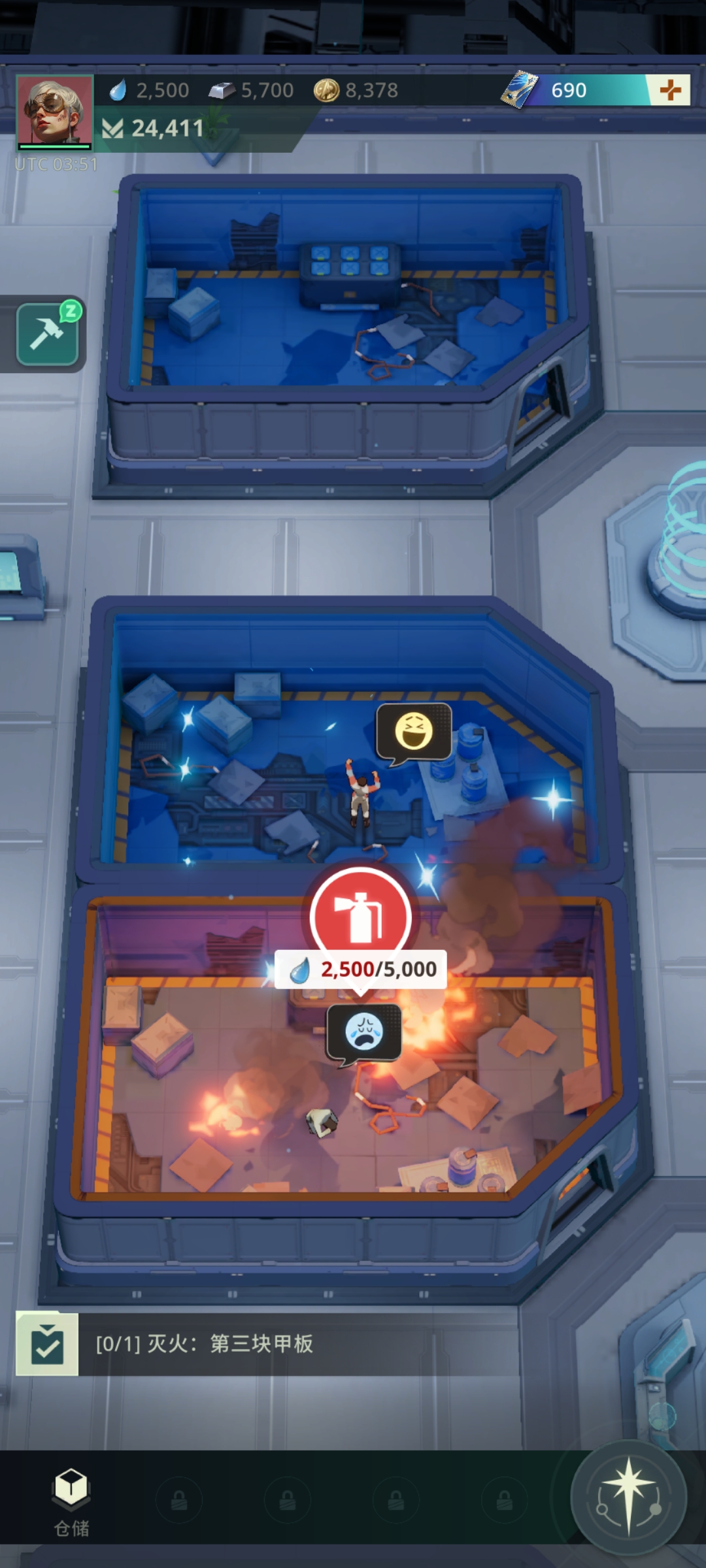 2、灭完火之后就要开始修复工作,需要消耗金属,如资源不够可到太空获取金属碎片。