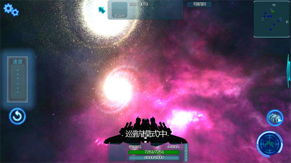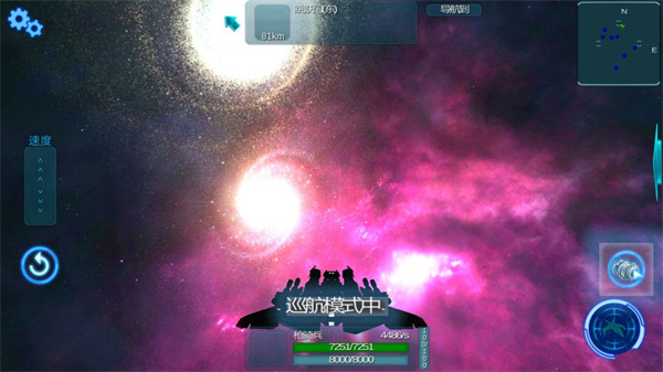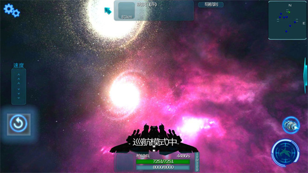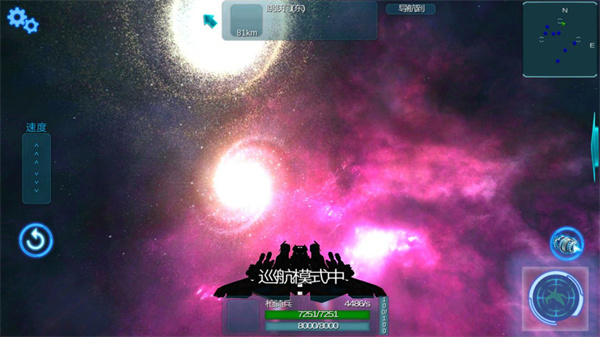 1、下侧绿色代表护盾(脱战可恢复),蓝色代表耐久(需要维修后方可恢复正常水平)左侧滑条控制速度增减,右下侧的两个键从下到上依次控制开火与巡航模式。进入巡航模式首先需要配备引擎,其次不能被攻击,十秒后可以进入巡航状态。根据装备的引擎性能会有不同百分比的增速。进入巡航状态后发起攻击或者受到攻击都会立即解除巡航状态。