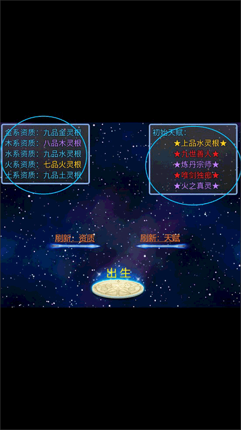 首先我们进入后会随机给我们分配灵根和天赋,灵根肯定是越高越好,天赋则是红色并且可以贴合自己灵根的天赋好,这个大家可以不用担心自己运气不好,在这可以进行刷新的,而且不限制次数,是不是很贴心呢?