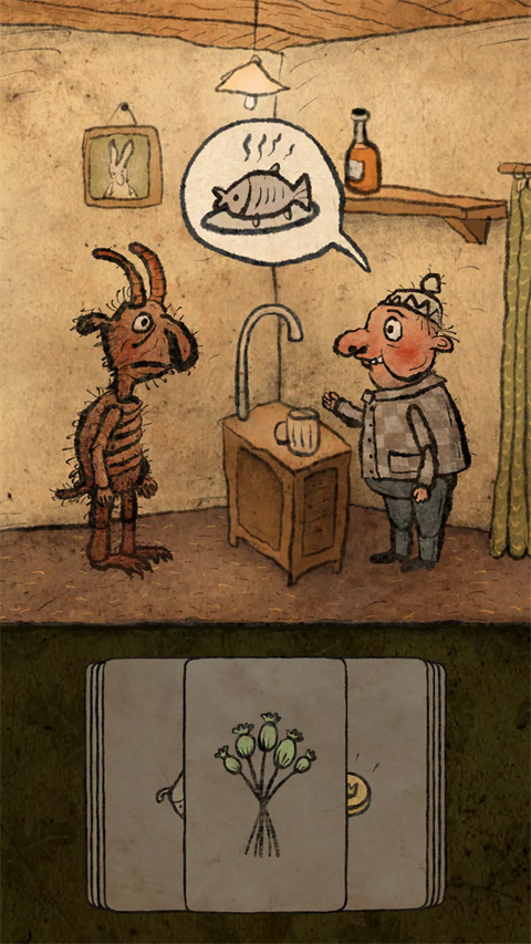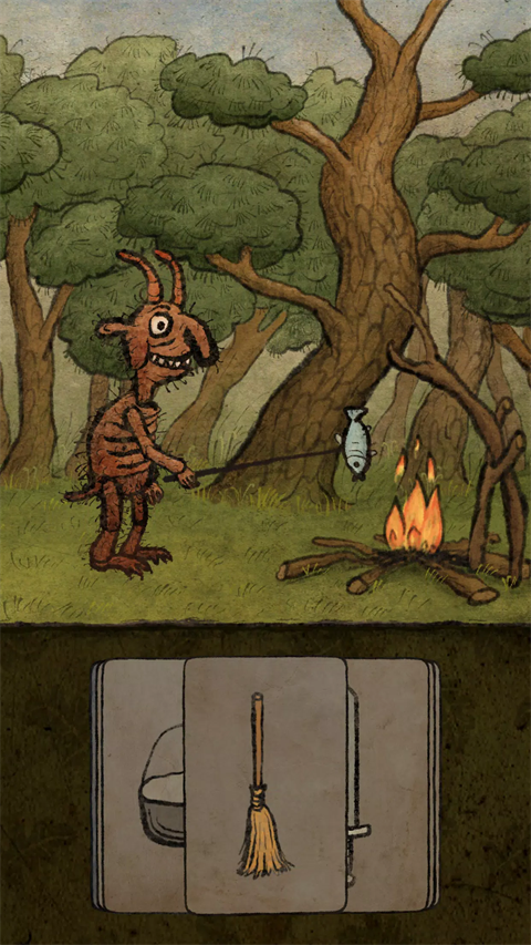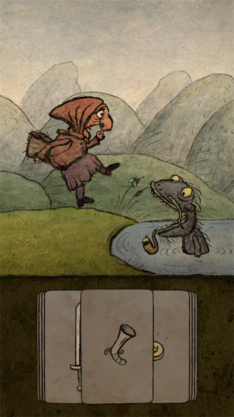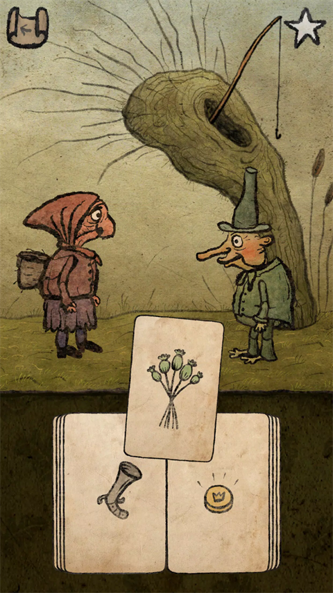 所有角色和道具以卡牌形式存在,通过拖拽卡牌与场景中的NPC或物体互动,推动剧情发展。