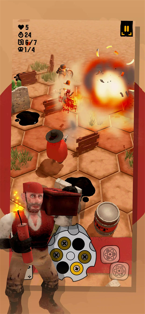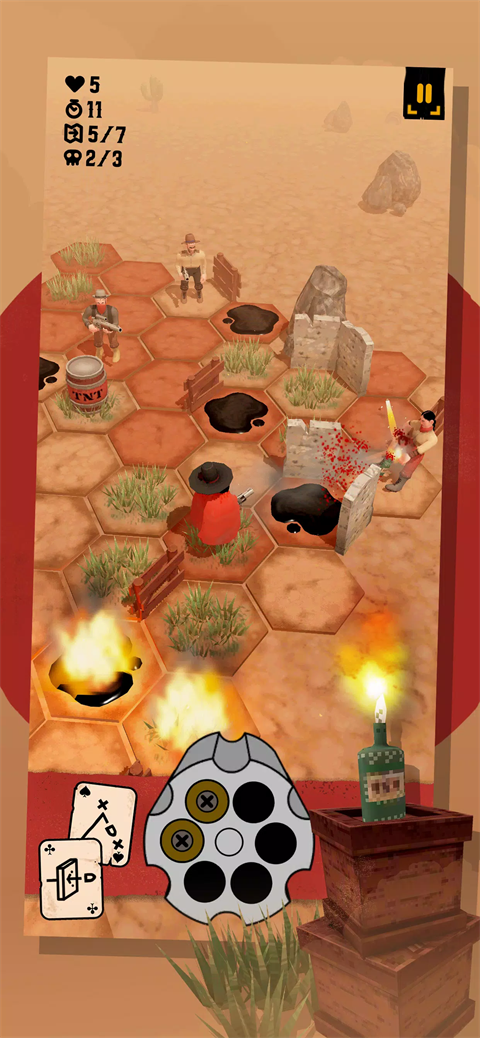 2、屏幕下方的弹仓不仅仅是标识子弹的方式,还是可以攻击的方向,并且牛仔射击一次,弹仓就会转动一次。