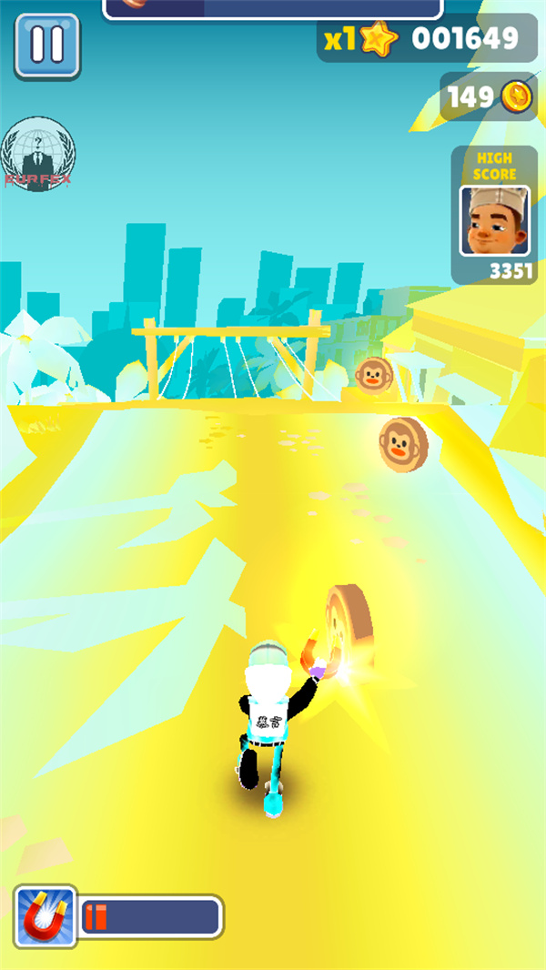 地铁跑酷慕言8.0最新版中的玩法和其他版本别无二致,玩家可以穿越地铁隧道中各种各样的障碍物并捡取路上的各种金币和道具来获得更高的分数。游戏中的金币也被修改为了可爱的猴子金币,明显的色差能让玩家一下就注意到防止遗漏。