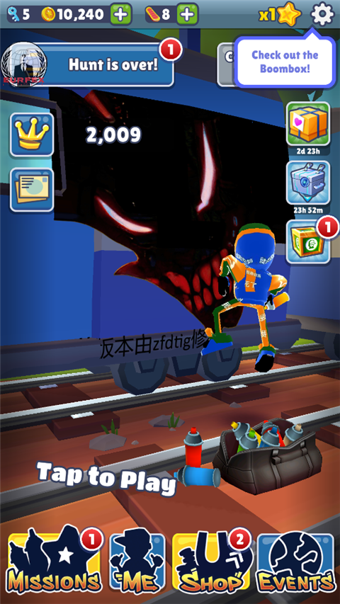 3、游戏中的道具分为主动和拾取的道具,主动道具滑板可以帮助你增加得分,还能保护你,拾取的道具有很多种,每一种都有不同功能。