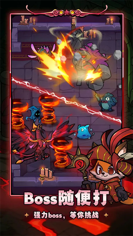 Boss与怪物伤害温和,拒绝秒杀挫败。关卡难度平滑成长,失败后可不断重试,肉鸽体验轻松愉快,总能通关。