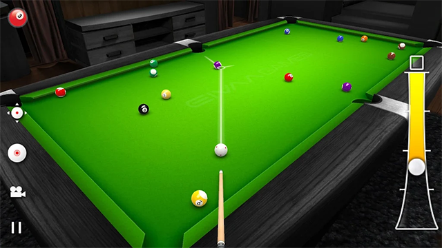 6、选择台球摆放位置后,点击右下角的对钩图标确认,用手指拖动右侧的“力度条”调整击球力度与角度,松开手指后,球杆将精准击球,台球应声而动。