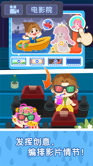 电影即将开始,宝宝记得戴好口罩、领取4D眼镜再检票入场哦。瞧,观众已逐渐就位,幕布上正放映着王子与公主的童话故事,宝宝找到自己的座位坐下,安静观影吧。