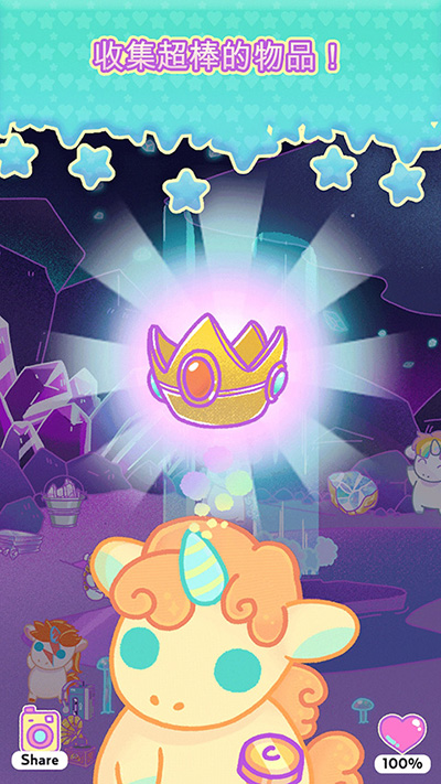 玩家可以派遣独角兽外出冒险,在广袤的动物世界中收集各种稀有的物品;这些物品可以用来解锁服饰和装扮道具,丰富独角兽和物品图鉴;