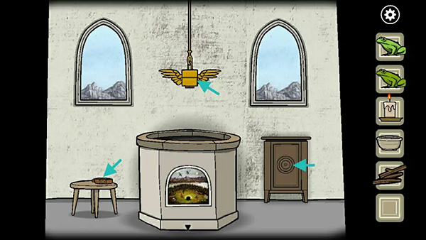 7、在小屋内放置木柴并用蜡烛点燃,将四只青蛙依次放入锅中煮成青蛙汤;