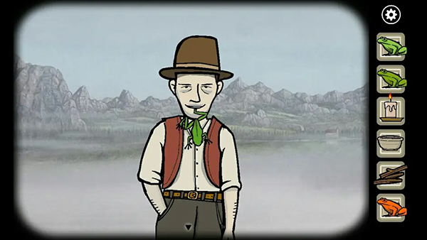 6、把腰带交给弟弟,点击他的嘴巴,从脚边拿到第四只青蛙;