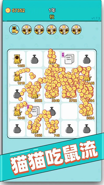 6、猫,可以消除相邻的老鼠和鱼,每次消除都能获得六个金币。