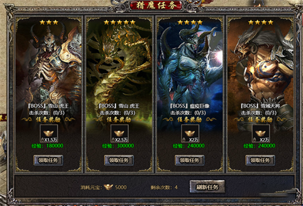 每日最多领取5次任务,完成星级越高的任务获得的奖励越丰富,玩家也可以通过消耗元宝刷新任务来领取高星级的任务获取丰富奖励。