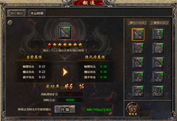 部位强化会提升属性,同时会消耗元宝以及相应的强化材料。