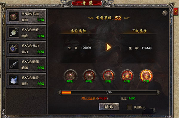 游戏中一共用有5种奇装,每种奇装提供不同的属性。玩家需要消耗对应的奇装材料来升级奇装,提升自己的战力。